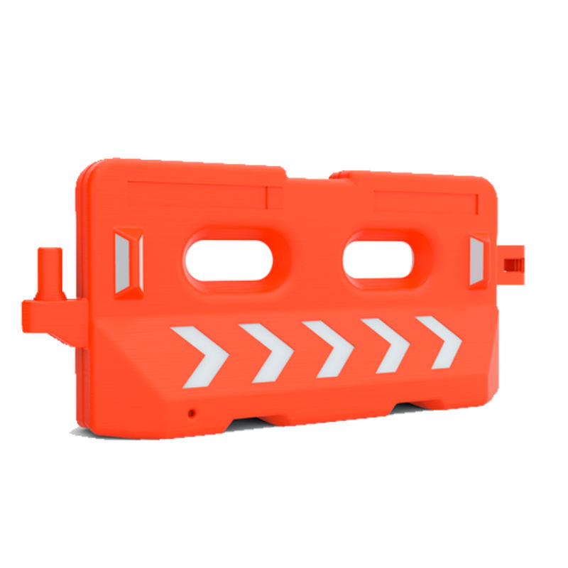 Novedosa barrera vial fabricada en polietileno de alto peso molecular. Lleva en la parte inferior 5 flechas tipo chevron por lado, adecuadas para dar orientación a los conductores. El nuevo sistema de ensamble facilita el cubrir grandes distancias de confinamiento en menor tiempo. Sistema de ensamble patentado ante el IMPI. Con 4 reflejantes en ángulo por lado. Una de las barreras más económicas existentes en el mercado. Pueden llenarse de agua o arena